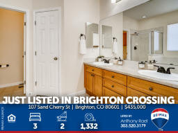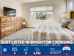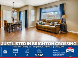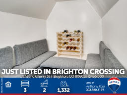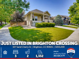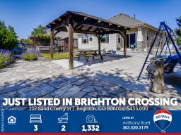 107 Sand Cherry St | Brighton CO 80601 | Brighton Crossing Main floor living at it's finest in Brighton Crossings with a backyard sanctuary that will take your breath away! Whether you're working from home, retreating from work or retired, this 3-bedroom ranch home will please the pickiest of buyers. Meticulously cared for and move-in ready. Nestled on a large corner lot surrounded by mature landscaping including 40-trees which provide the peace and tranquility not often found in the 'burbs. Entertain family & friends under the massive custom-built pergola or gather around the gas firepit and enjoy the gorgeous perennials that quickly transform you into what feels like a mountain retreat. There's even an underground wine cellar that you simply will not find anywhere at any price. Once the sun goes down, soak in the large jetted spa and appreciate all your blessings. Love gardening? You'll appreciate the greenhouse with drip system + custom-built garden sheds so you can care for your plants year-round. Inside you'll find new carpeting, new custom window blinds, fresh paint, tile & hardwood flooring, large master suite with 5pc bath + walk-in closet. Brighton Crossings is the perfect community to gain the luxury of time saved and time enjoyed. Surrounded by 9 Parks and trails, you’ll find playgrounds, open grass lawns, splash pads and more with miles of interconnected walkways. Nearby is the King Soopers Marketplace, with pizza, hair and nail salons, bank and other retailers for your one-stop-shop. The 3,200 sqft Crossings Fitness Center for residents only, is stocked with new exercise equipment, flex space, amazing western views, and a kids area. 2.5-acre Crossings Dog Park for your furry family members, big and small, to come play with their neighbors. Brand New Venture Center Water Park with even bigger pools and larger facility. Brighton Crossings lives within the Brighton 27J school district, which includes elementary, middle and high schools minutes from your new home. Charter and other school types are also nearby. Available for a Quick Closing & Possession after July 3rd! Listed by Anthony Rael. For more info, 'Just Call Ants' at 303/520-3179.