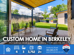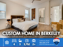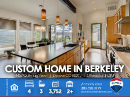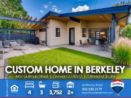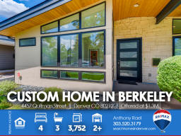 4457 Quitman St | Denver CO 80212 | Berkeley Welcome to this spectacular custom-built home in the heart of Berkeley - one of Denver's most cherished, and fastest-changing, neighborhoods. Original property was scraped in 2014 to make way for this Frank Lloyd Wright design-inspired and meticulously crafted sprawling ranch home which is sure to satisfy the pickiest homebuyer seeking to take residence in a premium location within 15-minutes of downtown Denver. Solid light cherry hardwood floors cascade from the front entry throughout the entire main living areas. The gourmet kitchen boasts Paykel and Fisher stainless steel appliances including a gas-fueled range & double oven. The massive island doubles as meal prep space as well as casual bar stool seating area. The dining area can accommodate large dinner parties and seamlessly transitions outdoors through the imported Australian trifold glass doors that open up to an extended covered patio. Additionally, there's ample space under the pergola for entertaining and outdoor dining. The spacious primary suite includes a spa-like bath bedrooms + three additional generous sized bedrooms and two additional baths. This home is perfectly designed to allow maximum natural light while preserving privacy with each window fitted with Hunter Douglas Silhouette window coverings throughout. From the style and sophistication to the abundant open concept that provides all the living and storage space you'll ever want or need. This custom gem is perfectly nestled between Berkeley & Rocky Mountain parks, fringed by walking trails, dog park and flanked by Tennyson Street with its boutiques, abundant eateries and laid-back taprooms + Oriental Theater, an old-school venue for movies and live music. Simply put, you will not find another home that compares anywhere in the Denver marketplace! Listed by Anthony Rael. For more info, 'Just Call Ants' at 303/520-3179.